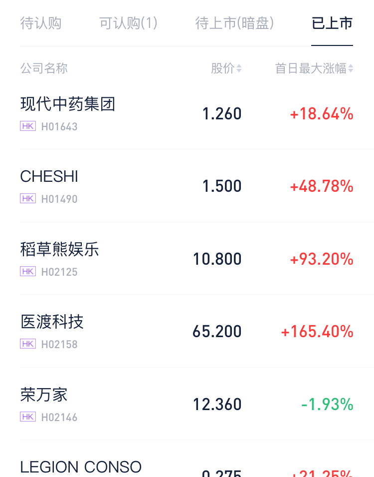 从香港证交所公布的认购情况来看,医渡科技的1手中签为20%,200稳1;网上车市1手中签仅为0.43%,250稳1;稻草熊娱乐1手中签率为6%,100稳1。 虽然中签率相对较低,但从首日上市表现来看,涨幅还是非常可观的,如下图所示。