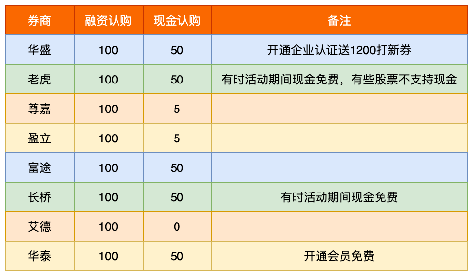 认购分成融资认购和现金认购。融资认购就是借钱认购,不同的券商提供的杠杆倍数不同,有5倍、10倍、15倍、20倍等倍数。融资认购的打新成本一般是100港币手续费 + 融资资金的利息,一般而言融资利息相对手续费还是要少的,就几十港币。现金认购,就是直接完全用自己的钱认购,不同券商的现金认购手续费不同。下图是我这边开通的港股证券账号的不同券商的融资和现金认购的手续费情况。