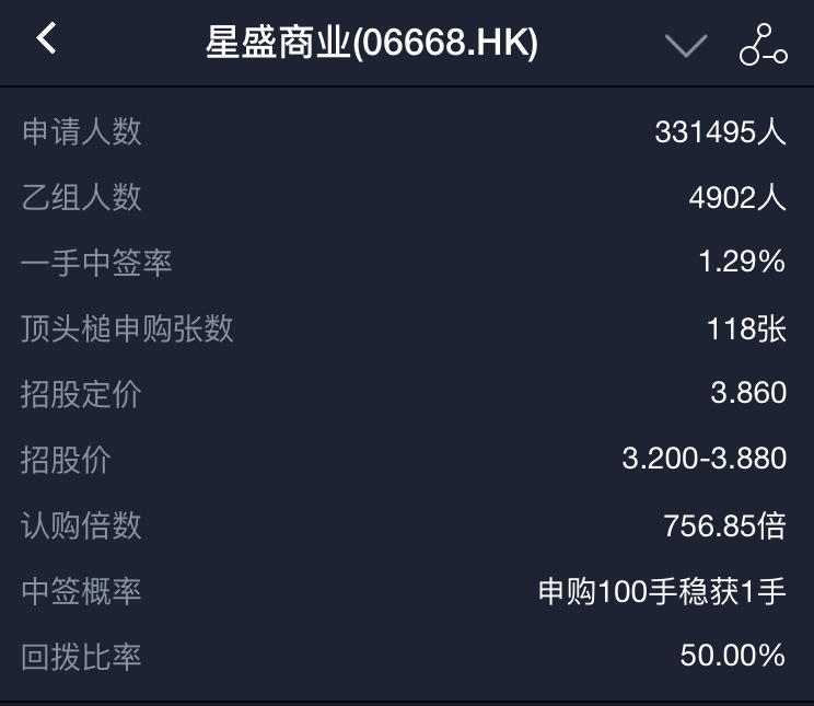 以上周认购的星盛商业为例,星盛商业属于物业股,且公司盈利基本面也可以,但是募资额度比较少,总共才800多万港币,相对于京东健康等募资上百亿的股票而言,完全是一个小票。考虑到认购人数会比较多,中签率会比较低,因此我8个账户都只现金认购了一手,没有融资认购。