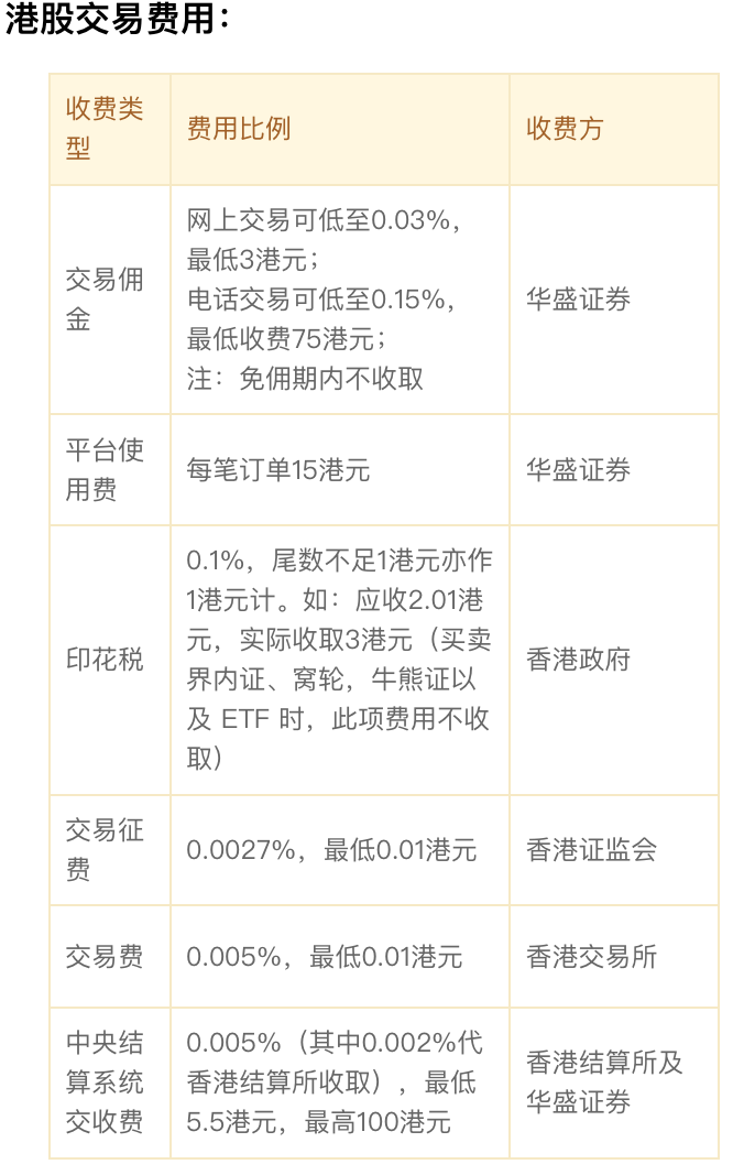 港股新股中签后,当需要卖出时,就要缴纳诸如交易征费、交易费、印花税、券商佣金以及平台使用费等费用。这些费用由不同的征收方来进行征收。这里以华盛通证券的收费标准举例,如下图所示。其中,交易征费和交易费等几乎可以忽略不计,最主要的还是平台使用费和交易佣金。