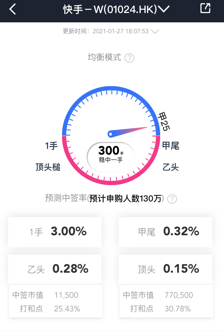 因此这里有个概念叫,打和点,也称盈亏平衡点, 就是我们在认购新股时,新股上涨多少后,才能做到基本的不赚钱也不亏钱。因此,在港股打新时,需要合理控制打新费用,避免打和点太高导致即使新股上涨时依然是亏钱的情况出现。 使用不同的方式认购新股的打和点,是不一样的。这里以快手科技乙头融资中签一手的情况下,其打和点如下图所示,打和点高达25%。从目前的情况来看,对于乙头来说打和点有点高,但快手科技只要中签依然是赚钱的。