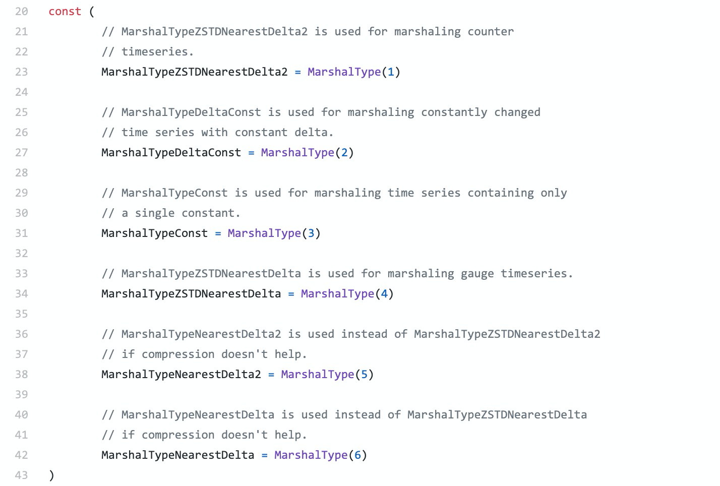 timestamps.bin文件中,包含一系列时间线的时间戳压缩块timestampsData; values.bin文件中,包含的一系列时间线的指标值压缩块valuesData。 其中,timestampsData和values.data会根据时序数据特征进行压缩,整体上的压缩思路是:先做时序压缩,然后在做通用压缩。比如,先做delta-of-delta计算或者异或计算,然后根据情况做zig-zag,最后再根据情况做一次ZSTD压缩,VictoriaMetrics支持的压缩算法或者类型主要有6种,如下图所示,压缩编码源码在lib/encoding/encoding.go文件中。