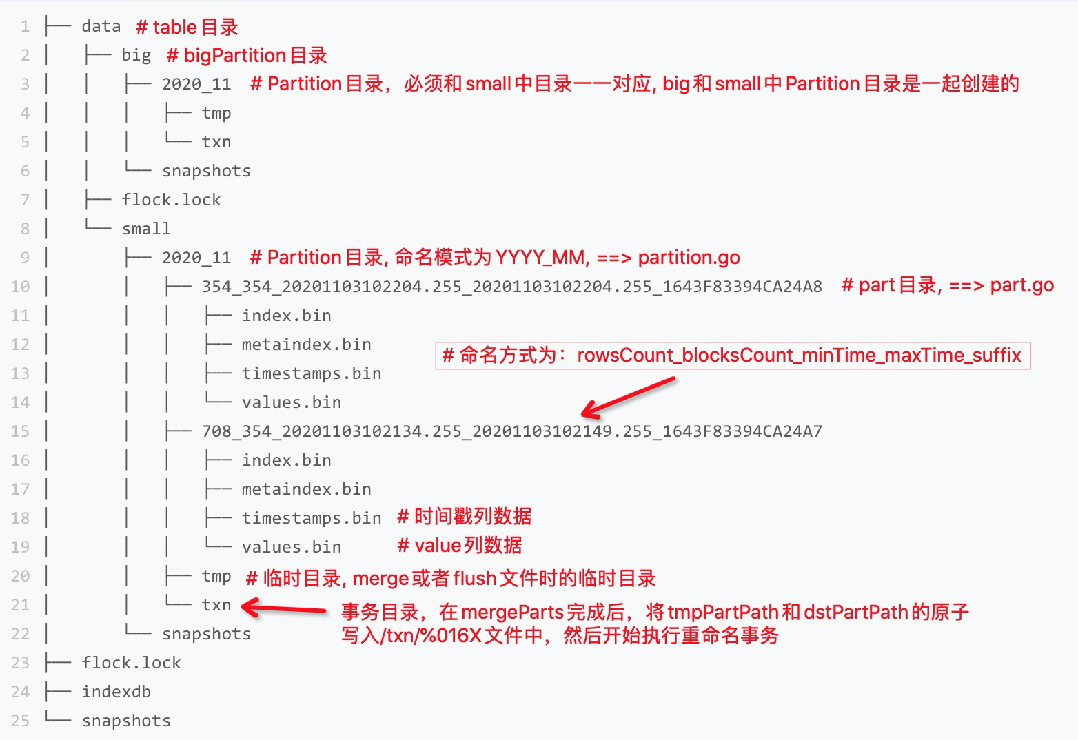 在small目录下,以月为单位不断生成partition目录,比如上图中的2020_11目录,对应的实现在源码lib/storage/partition.go中。partition目录包括part目录、临时目录tmp、 事务目录txn等三个目录。