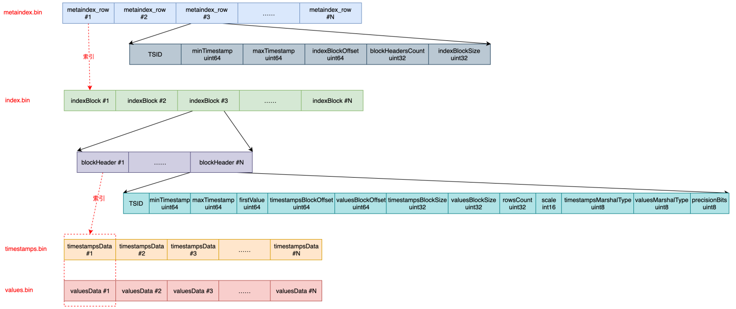 index.bin文件中,包含一系列的indexBlock, 每个indexBlock又包含一系列blockHeader,每个blockHeader的包含时间线标识TSID、最小时间戳minTimestamp、最大时间戳maxTimestamp、第一个指标值firstValue、时间戳数据块偏移timestampsBlockOffset、指标值数据块偏移valuesBlockOffset等内容。