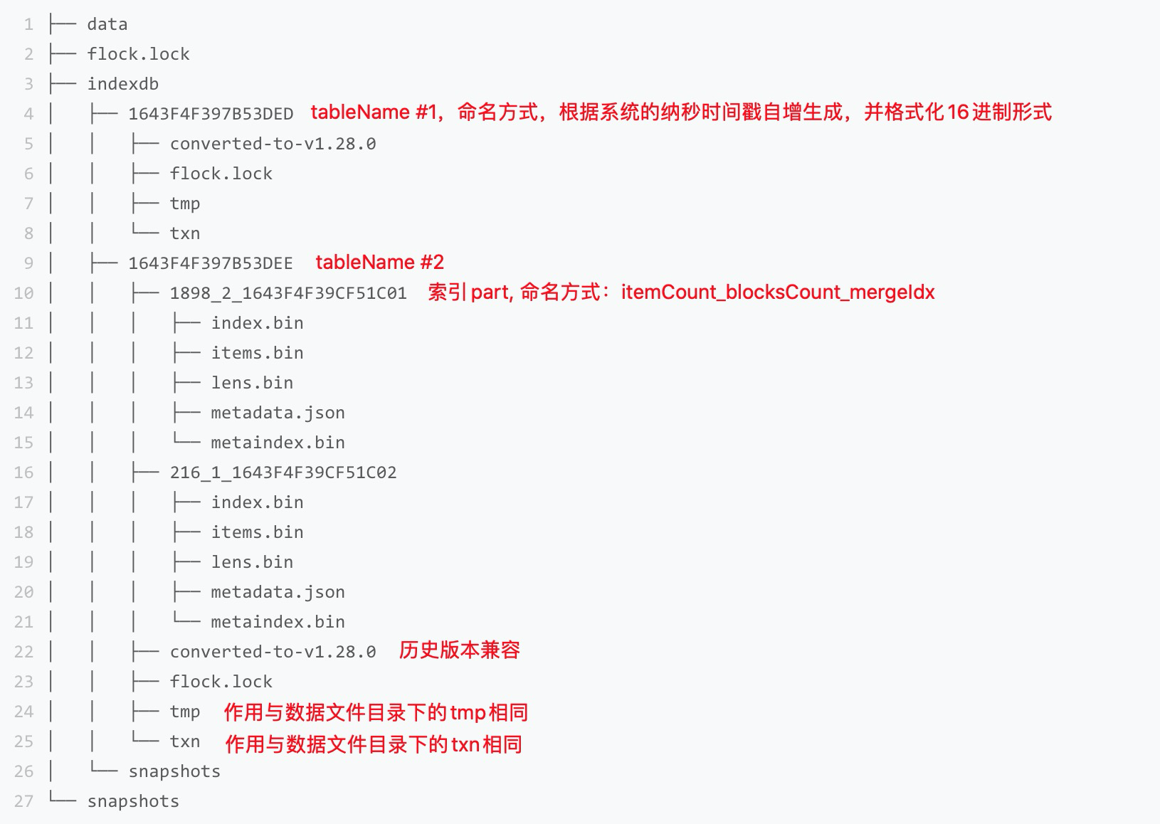 索引目录indexdb的具体结构,如下图所示,在图中使用红色文字,对主要目录或文件做了简单说明。与数据目录不同的是,indexdb目录下由多个table目录,每个table目录代表一个完整的自治的索引,每个table目录下,又有多个不同的part目录,part命名方式比较简单,有文件包含的item数itemsCount和block数blocksCount, 以及根据系统纳秒时间戳自增生成的mergeIdx的16进制表示。