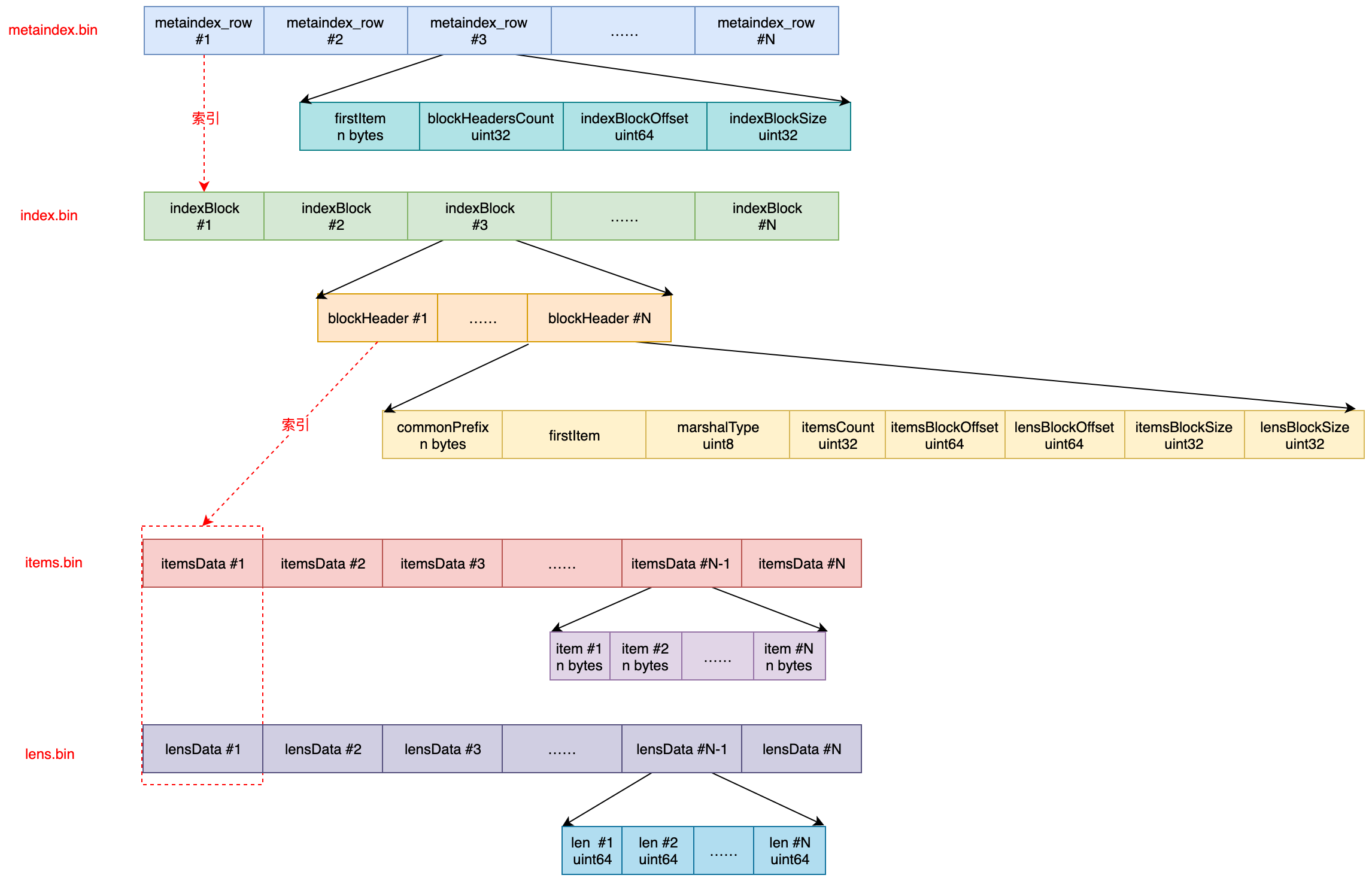 index.bin文件中,包含一系列的indexBlock, 每个indexBlock又包含一系列blockHeader,每个blockHeader的包含item的公共前缀commonPrefix、最小项firstItem、itemsData的序列化类型marshalType、itemsData包含的item数、item块的偏移itemsBlockOffset等内容。
