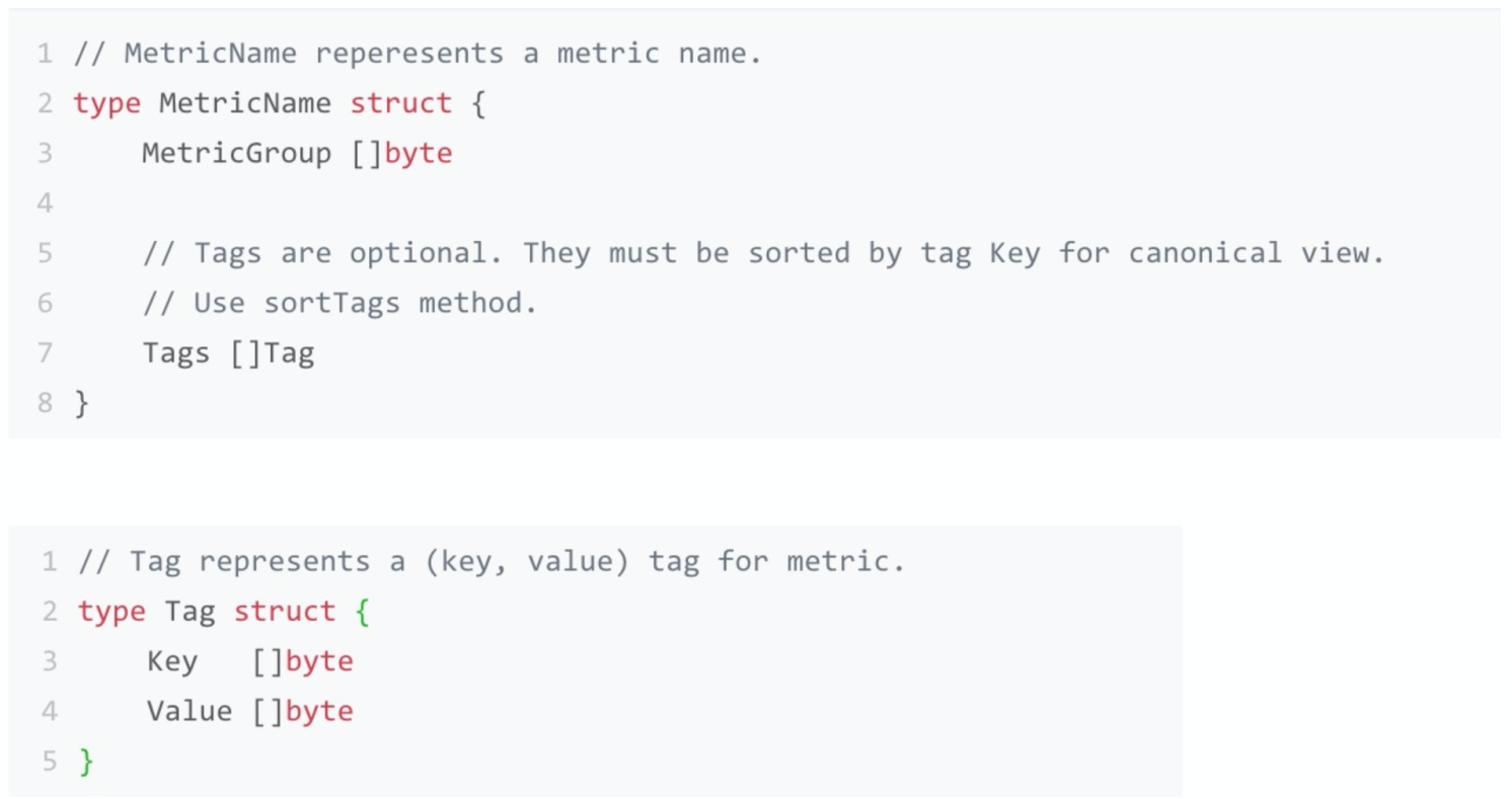 VictoriaMetrics的MetricName的结构如下所示,包含MetricGroup字节数组和Tag数组,其中,MetricGroup是可选的,每个Tag由Key和Value等字节数组构成。