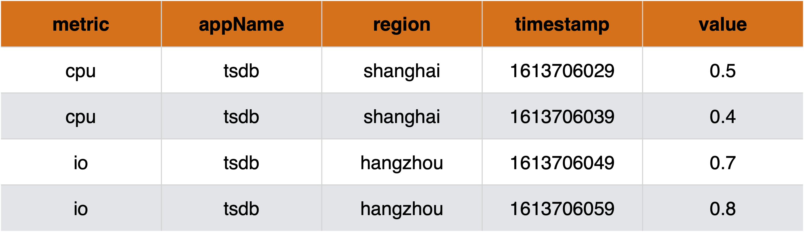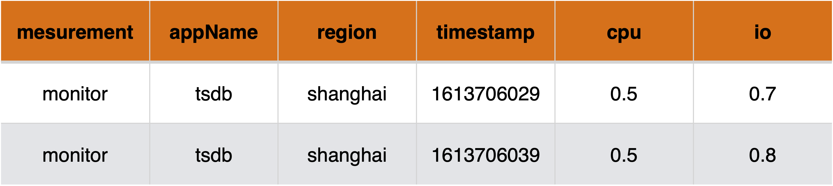 多值的模型则是针对数据源建模,我们每一行数据针对的是一个数据源,它的被测量的多个指标在同一列上,如下图所示,一行数据有多个指标值,即有cpu和io两列。目前采用多值模型的时序数据库,有InfluxDB、TimescaleDB等。