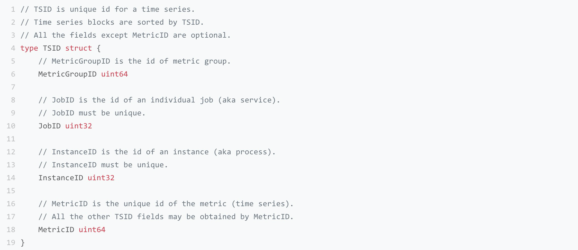 - MetricID,使用VictoriaMetrics进程启动时的系统纳秒时间戳自增生成。