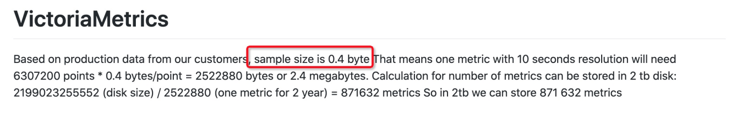 VictoriaMetrics文档中宣称在生产环境中,每个数据点(8字节时间戳 + 8字节value共计16字节)压缩后小于1个字节,最高可达 0.4字节,如下所示。