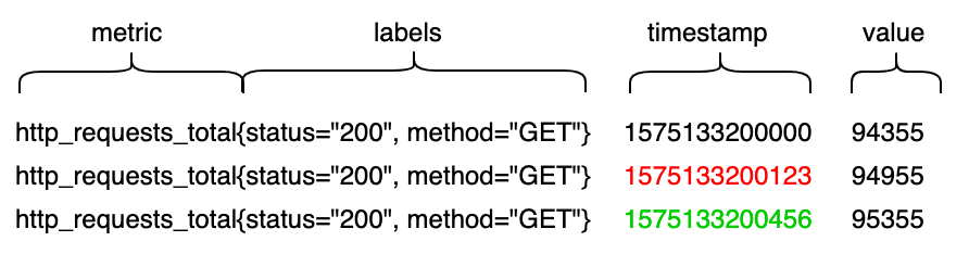 - tag -> metricID,即 status=”200” -> 51106185174286, method=”GET” -> 51106185174286, “” = http_requests_total -> 51106185174286