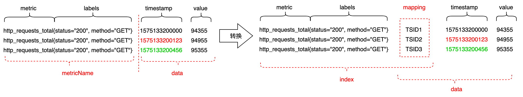 - metricID -> metricName,即51106185174286 -> http_requests_total{status=”200”, method=”GET”}